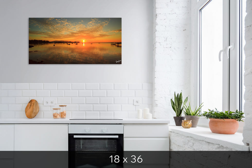 And what makes this large nautical wall art so magnificent is the glassy water reflecting the expansive orange sunset clouds. I broke with conventional photography composition guidelines and put the horizon line straight down the center of the frame of this boat photograph. This creates a magical symmetry – as above, so below. Taken in 2012, many call this my original nautical décor masterpiece.